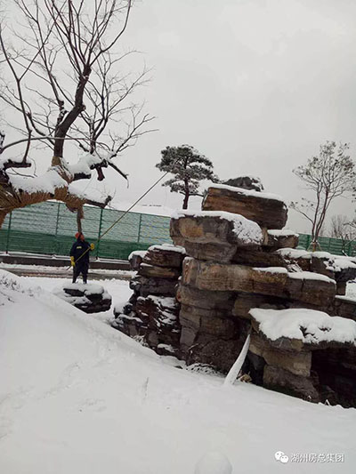 為確保新植苗木的安全,特別是造形樹不被積雪壓壞,承建申嘉湖高速湖州東互通區(qū)及申申高速連接線湖鹽公路段綠化提升工程的湖州中恒園林建設有限公司,26日一大早就派出施工人員,奔赴互通區(qū)現(xiàn)場,用竹竿拍除樹枝上的積雪,確保整個工程的綠化水準,提升湖州東大門的形象品質。