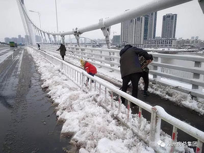 1月26日早晨,二環(huán)南路浮玉大橋、黃泥港大橋等路段均出現(xiàn)了道路積雪、結冰等現(xiàn)象,給交通安全帶來了極大的安全隱患。大雪無情人有情,我公司中心城市外環(huán)道路東南段建設項目部、前期工程部立即做出反應,安排抗凍防雪搶險小組奔赴現(xiàn)場,清掃道路積雪,并安排了融雪劑、防滑石子等搶險物資,以備不時之需。