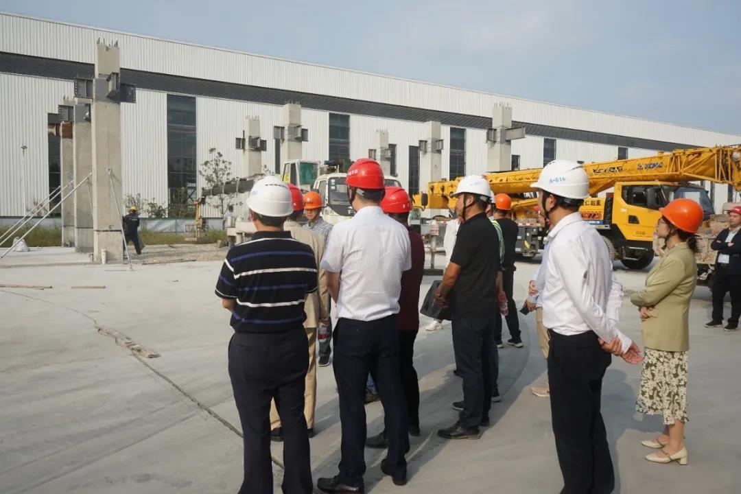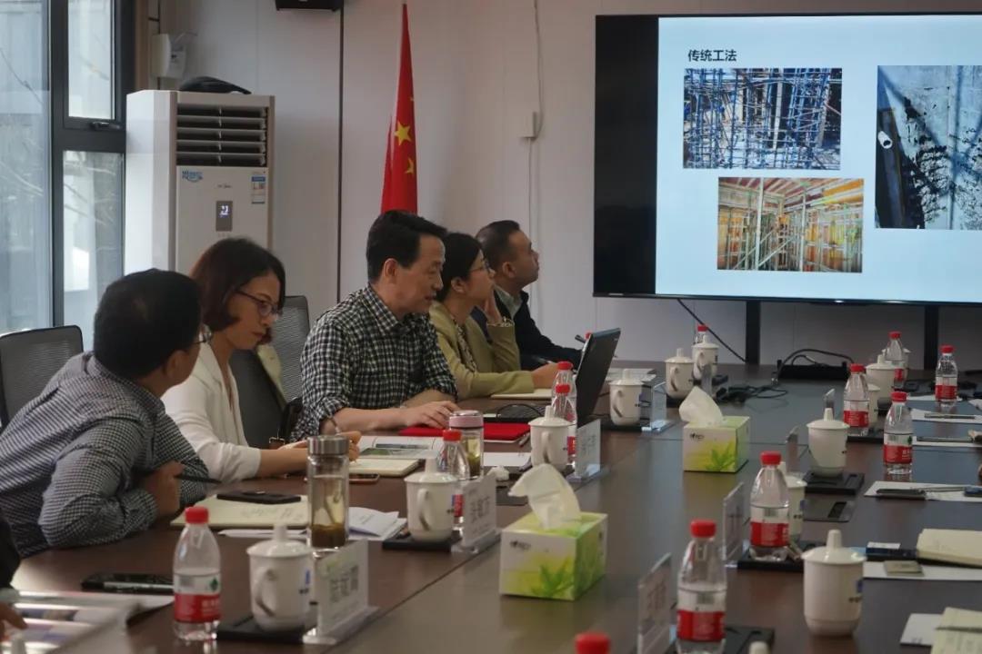 會前,大家參觀了基地內各條生產線、構件展示區和吊裝現場,了解了構件生產工藝、工藝布置、設備運行情況和裝配式建筑吊裝的要點與難點。為加深大家對裝配式混凝土的了解,趙教授還與技術人員就PC生產的工藝流程及關鍵工序等進行了探討交流,并對基地下一步發展運營提出了寶貴的意見與建議。