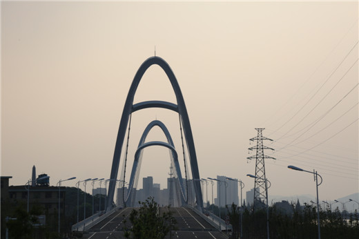 外環道路東南段全線設置雙向六車道或八車道加多功能車道,道路建設寬度為60米,道路設計時速70公里。新建成的浮玉大橋橋長585米,橋面主跨228米,寬41.6米,兩個鋼塔高71.5米。鋼結構主橋由37塊鋼箱梁吊裝焊接而成,懸浮于水面,總重達3500余噸。