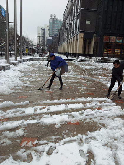 年前下了兩場大雪,愛山廣場路面積雪給通行帶來了極大的不便,也影響了周邊店鋪正常營業(yè)。公司團(tuán)委兩次組織青年團(tuán)員掃雪鏟冰。大家冒著風(fēng)雪,不顧嚴(yán)寒迅速開動,趕在路面凍結(jié)以前將積雪清除,現(xiàn)場呈現(xiàn)出一派熱火朝天的景象。在幾個小時的共同努力下,愛山廣場的一些主要路面得到了清掃,保障了車輛順利通行,方便了行人安全出行,同時也為商業(yè)街區(qū)的正常營業(yè)提供了良好的環(huán)境。